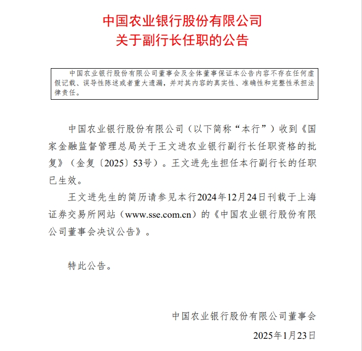 中国网财经1月24日讯昨日,农业银行发布关于副行长任职的公告显示,该行收到《国家金融监督管理总局关于王文进农业银行副行长任职资格的批复》(金复〔2025〕53号)。王文进担任农业银行副行长的任职已生效。